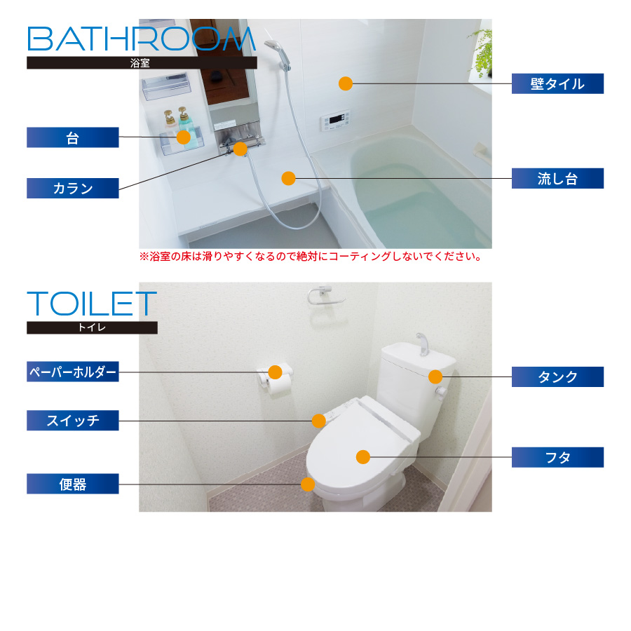 ※浴室の床は滑りやすくなるので絶対にコーティングしないでください。